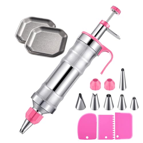 BLSOJEET - مكبس معجنات من الستانلس ستيل، مكبس بسكويت للخبز، مع صينيتين من الستانلس ستيل، 6 فوهات للتزيين، 3 مكشطة كريمة، قابل للازالة وسهل التنظيف للكيك والشوكولاتة