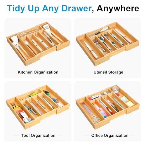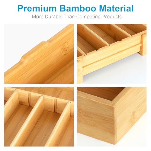 STS SELECTED - منظم أدوات مائدة من البامبو قابل للتوسيع، صينية أدوات مائدة قابلة للتعديل مع 3 فواصل قابلة للإزالة و5 مسارات، منظم أدراج لأدوات تناول الطعام والأدوات المكتبية والأدوات من اس تي اس سيليكتد، 32-52 سم