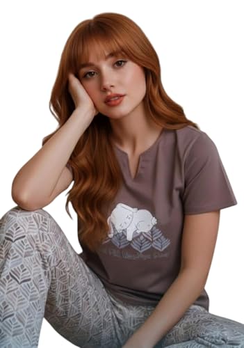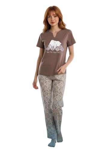 Generic - بيجامة صيفي نص كم تيشيرت بتصميم شعار و بنطلون بتصميم منقوش قطن للنساء