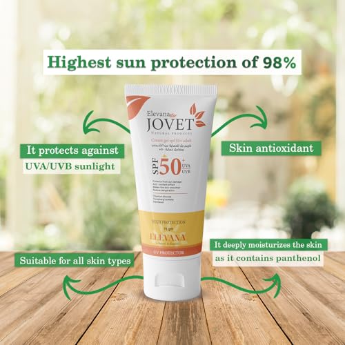 JOVET - جل كريم واقي من الشمس بعامل حماية 50+ للبالغين واسعة الطيف مع فوائد مضادة للاكسدة حاجب شمس مرطب للبشرة المجففة يحمي الاشعة فوق البنفسجية فئة A وB 75 مل اليفانا
