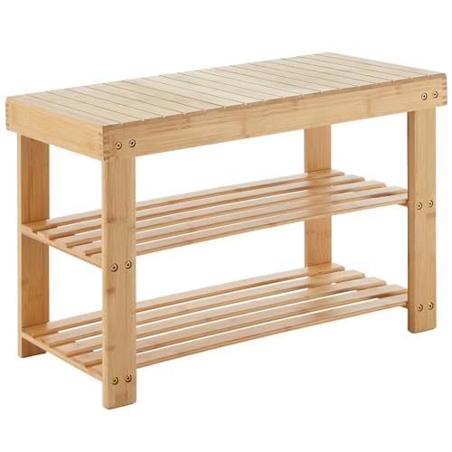 Sweetcrispy - مقعد رف احذية من 3 طبقات من سويت كرسبي، منظم تخزين للمدخل من الخيزران، حامل احذية لمدخل الباب الامامي وغرفة النوم وغرفة المعيشة، سعة 280 باوند، 11.3 × 27.6 × 17.8 انش، خشب فاتح