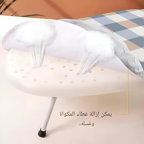 - طاولة كي صغيرة الحجم وقابلة للطي مصممة للمساحات الصغيرة، تتميز بقفل آمن للحفاظ على ثباتها أثناء الاستخدام وارتفاع قابل للتعديل للكي المريح عبر مختلف المستخدمين.