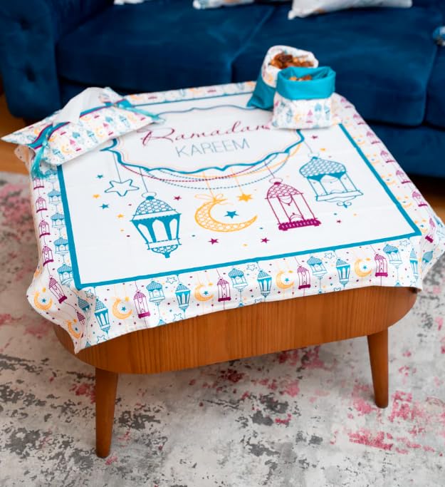 - تصميم احتفالي: يتميز بتصميم مركزي جميل لعبارة "رمضان كريم" مع فوانيس ملونة وأقمار هلال ونجوم بألوان زرقاء ووردية وصفراء نابضة بالحياة، مما يضفي جوًا احتفاليًا على تجمعاتك.