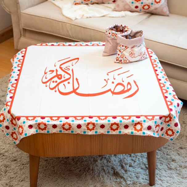 Generic - مفرش طاولة مع خط عربي، قماش مخملي ناعم، حواف بنمط هندسي، متوفر بمقاسات متعددة، ابيض مع تصميم برتقالي وازرق (90 × 90)