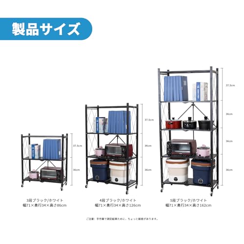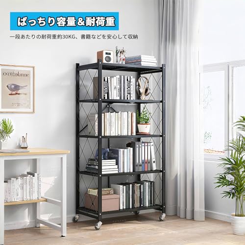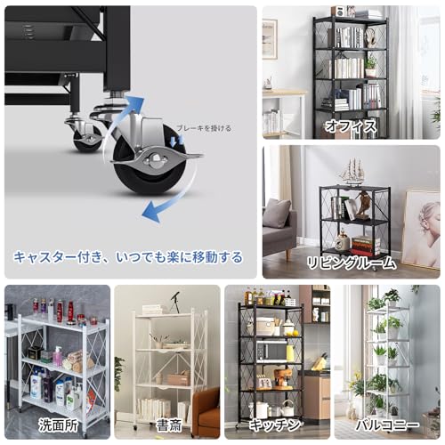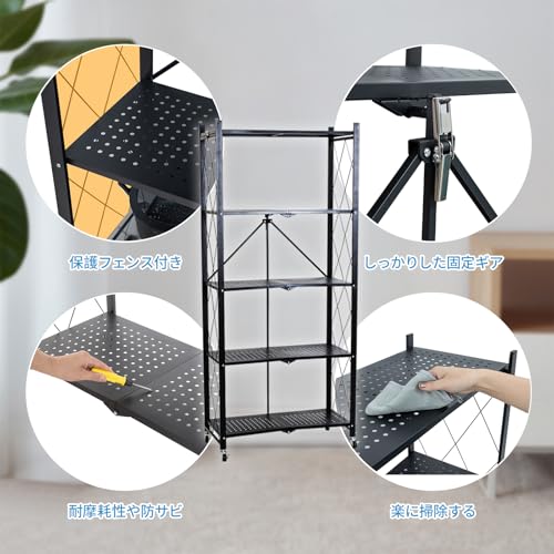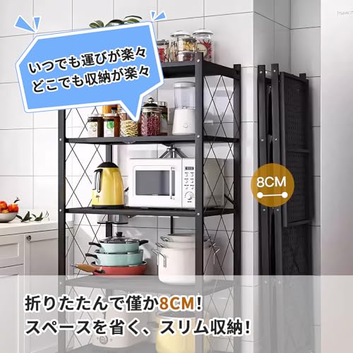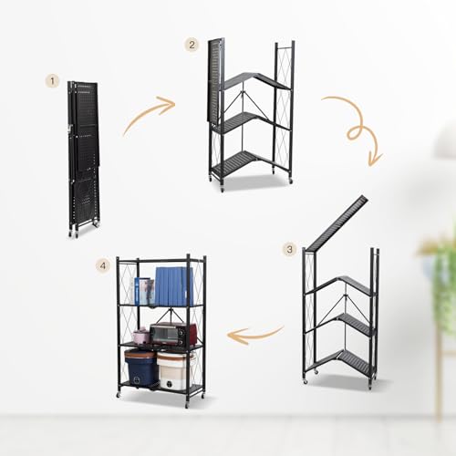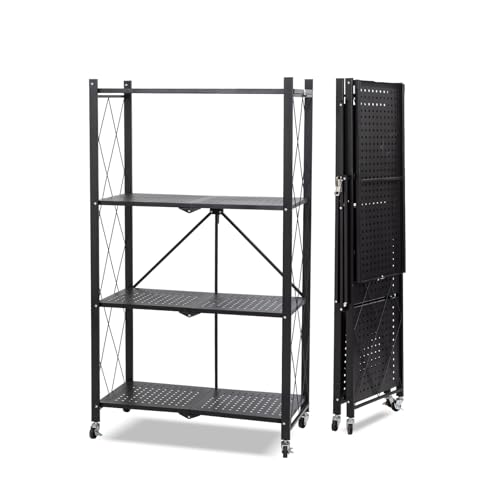 TANCHO - تانشو رف ستيل قابل للطي، يمكن فتحه فقط، رف تخزين، رف معدني مع عجلات، رف مفتوح قابل للطي، رف مطبخ، رف مريح للتحرك حول الخزانة، مقاوم للصدا (اسود، 4 طبقات، عرض