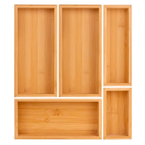 Teicui - مجموعة منظم ادراج من الخيزران النقي مكونة 5 قطع تيكوي - مثالية لادوات المطبخ الفضية والمكياج وتنظيم المكتب والمزيد مع مقسم الادراج الصديق للبيئة 1