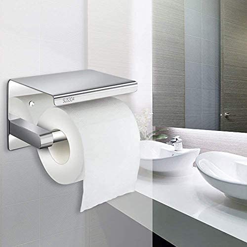 Telgoner - حامل ورق تواليت لاصق من تيلجونر، يستخدم لحمل بكرة ورق التواليت، مصنوع من الستانلس ستيل SUS304 مع رف تخزين للموبايل (فضي)