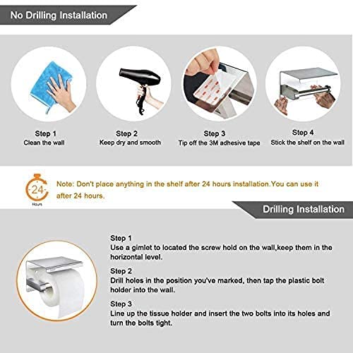 - ✔ شريط لاصق 3M سهل التركيب بدون ثقب، ما عليك سوى إزالة الغشاء من الحشوة ذاتية اللصق ولصق حامل ورق التواليت المطفي على السطح الأملس للحائط. أو قم بالثقب باستخدام المسامير لتثبيت حامل ورق التواليت الأسود مع الرف
