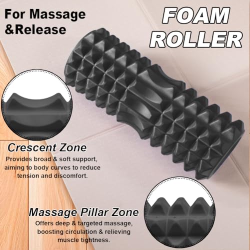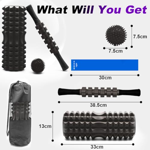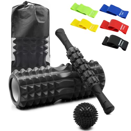 TINY SPARK - بكرة إسفنجية 9 في 1 من تايني سبارك، بكرات يوجا لتدليك العضلات، بكرة إسفنجية مع عصا بكرة عضلية، بكرة تدليك، كرة تدليك سبايك، 4 قطع من أشرطة المقاومة الحلقية، كل ذلك في شنطة حمل (33 سم، أسود)