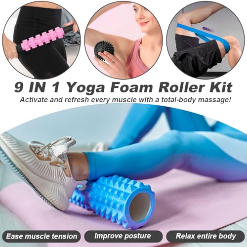 - 【مجموعة لياقة بدنية متعددة الاستخدامات】مناسبة للعدائين والرياضيين وعشاق اليوغا والسباحين، تساعد مجموعة بكرات اليوغا 9 في 1 على استرخاء العضلات والمساعدة في تمارين التمدد بعد التمرين. إنها مثالية لتقليل تراكم حمض اللاكتيك في الكتفين والذراعين والساقين والظهر والأرداف والفخذين وأوتار الركبة والكواد والعجول