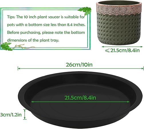 • لأصص النباتات ذات قطر قاعدة أقل من 21.3 سم: مقاس مجموعة الـ 6 صواني لأواني الزهور: 25.4 سم من الأعلى، 21.3 سم من الأسفل، وعمق 1.23 سم؛ صحن النباتات البلاستيكي مناسب للأصص ذات قطر قاعدة أقل من 21.3 سم؛ يرجى قياس حجم أصيص النبات قبل الشراء.