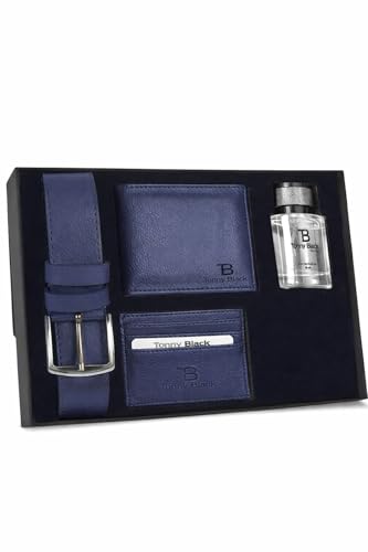 Generic - Tonny Black طقم هدايا رجالي 4 قطع، حزام جلد، محفظة، حافظة بطاقات، عطر، أسود (كـحلى)