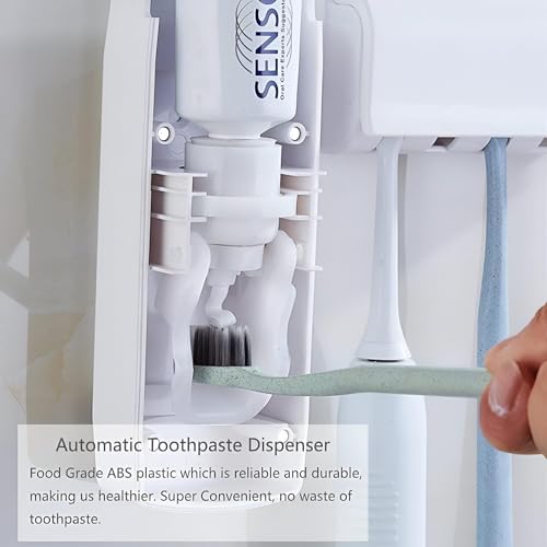 Generic - منظم فرشاة الاسنان - تخزين حمام متعدد الوظائف يثبت على الحائط مع موزع معجون اسنان اوتوماتيكي وحامل عائلي صحي لاعداد العناية بالاسنان بشكل أنيق وموفر للمساحة في المنزل
