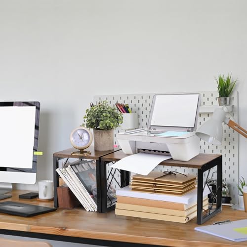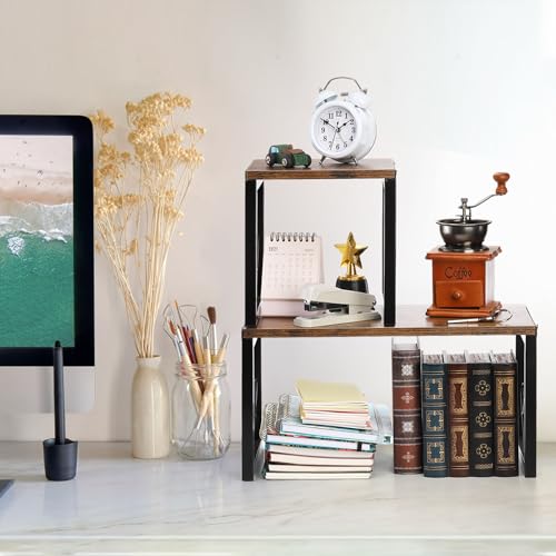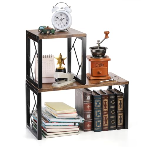 TOPZEA - توب زي رف مكتبي، رف منظم قائم بذاته من الخشب الريفي، رف كتب صغير فينتاج من طبقتين، رف تخزين مكتب مستقل قابل للتكديس رف مفتوح، رف عرض للمطبخ