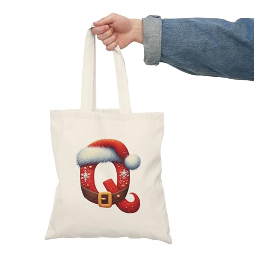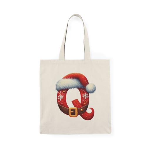 Generic - Tote Bag - شنطة قماش بسوستة – بحرف Q بتصميم كريسماس – حرف Q مزين بقبعة سانتا وحزام عيد الميلاد – شنطة خروج وتسوق مطبوعة – خفيفة ومتينة وصديقة للبيئة مناسبة للهدايا والجامعة