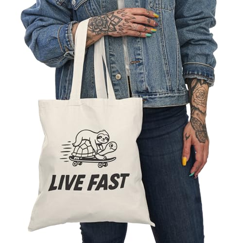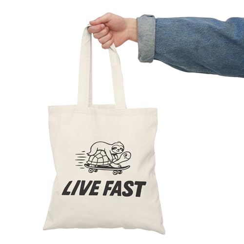 Generic - Tote Bag - شنطة قماش بسوستة – بتصميم مضحك برسمة كسلان وسلحفاة – تصميم كوميدي “عيش بسرعة” – تصميم لطيف للهدايا والمناسبات – شنطة خروج وتسوق مطبوعة – خفيفة ومتينة وصديقة للبيئة مناسبة للهدايا والجامعة