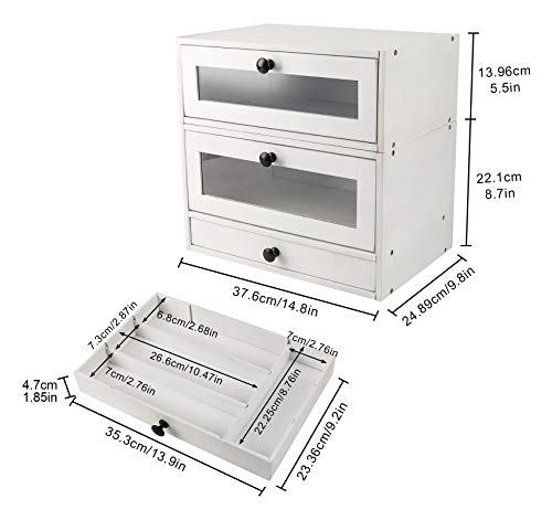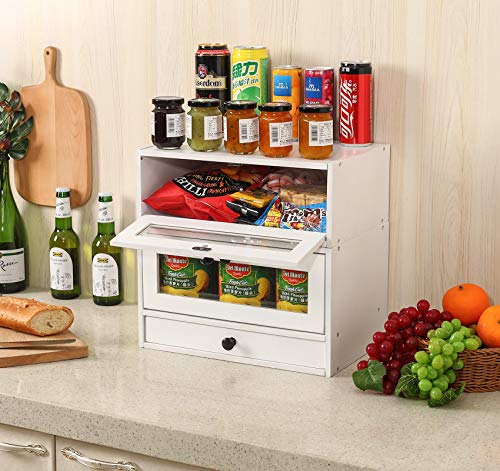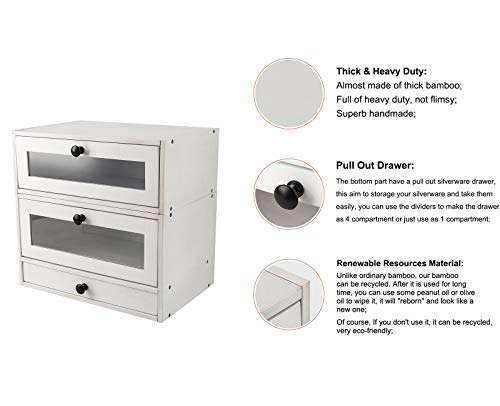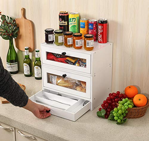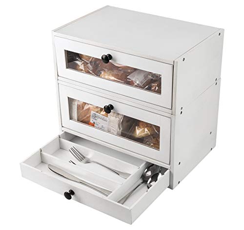 TQVAI - تي كيو في اي صندوق تخزين الخبز من طبقتين الخيزران الطبيعي مع نافذة شفافة وصينية ادوات تناول الطعام ودرج قابل للفصل - يتطلب التجميع ابيض