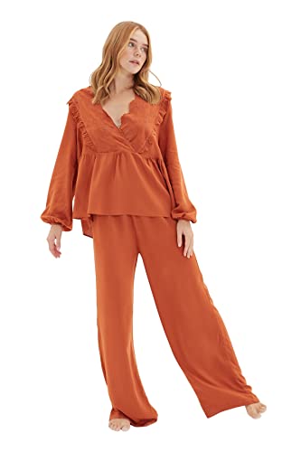 Trendyol - بيجامة طراز Thmaw22Pt0293 للنساء من نسيج محبوك ومكشكش ومطرز بالزهور من ترينديول، لون بني فاتح