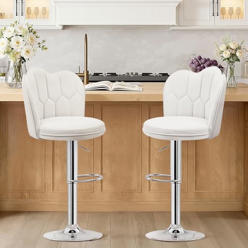 VECELO - كراسي بار قابلة للتعديل مع ظهر من فيسيلو، قطيفة بدون ذراع، مرتفعة للمطبخ والجزيرة، دوارة للحانة وغرفة الطعام وغرفة المعيشة، مجموعة من 2، أبيض