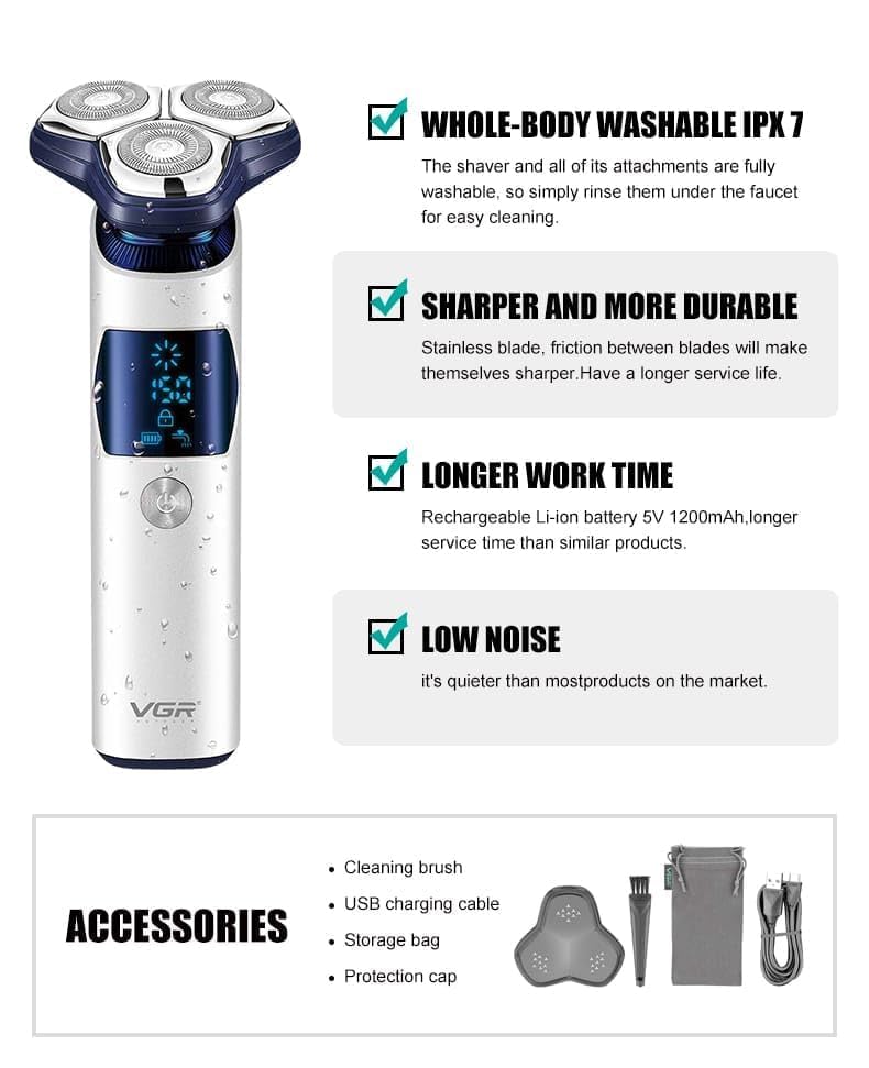 - تقنية متطورة: تتميز بأحدث نظام حلاقة دوار عائم ثلاثي الأبعاد من في جي ار للحصول على حلاقة أقرب وأكثر راحة بدون تهيج.