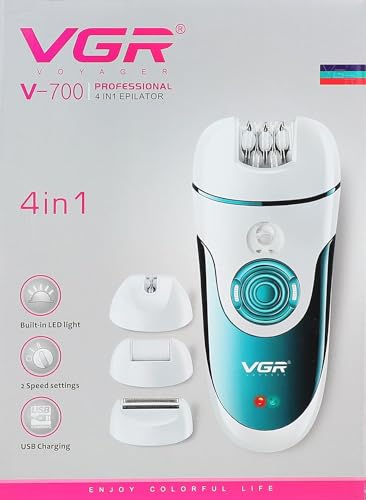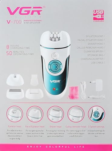 VGR - ماكينة حلاقة لاسلكية في جي ار 4 في 1 للنساء V-700 للوجه والساقين والابط والبكيني مع مزيل مسامير القدم للاستخدام الرطب والجاف، وقت تشغيل 50 دقيقة بطارية ليثيوم ايون 2×500 مللي امبير في الساعة شحن سريع