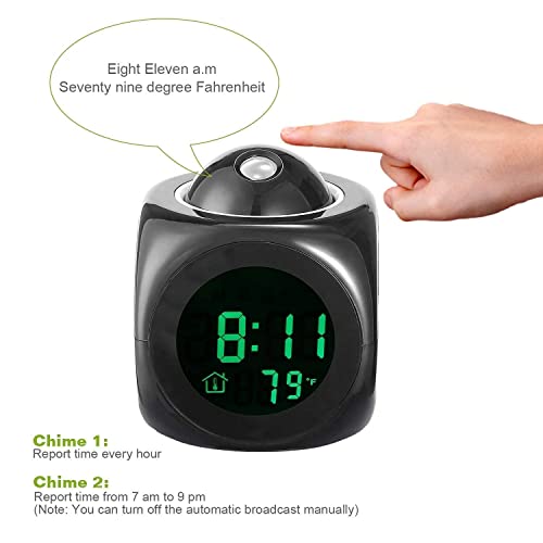 - ➤【تنبيه صوتي مع إضاءة خلفية وإسقاط الوقت】: في أي وضع، اضغط على الزر العلوي لإخبارك بالوقت الحالي باللغة الإنجليزية مع تشغيل الإضاءة الخلفية، وسيتم عرض الوقت الحالي على أي سطح مستوٍ لمدة 10 ثوانٍ تقريبًا. بالإضافة إلى ذلك، يمكن تحريك رأس الإسقاط ذهابًا وإيابًا للسماح لنمط وقت العرض بالتحرك بشكل مناسب.