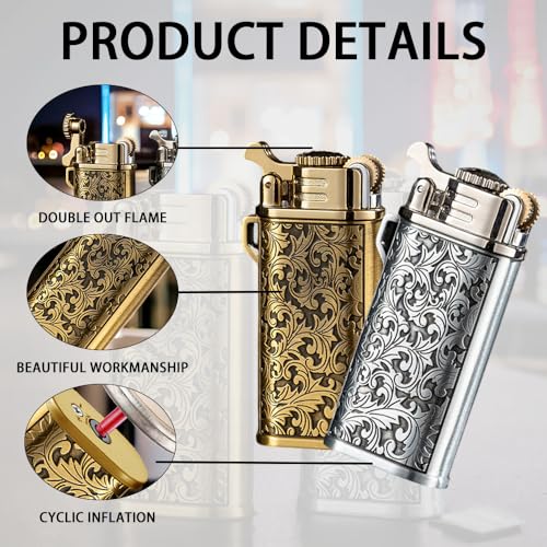- [تصميم أنيق ومبتكر] هذه الولاعة ذات العجلات الدوارة القلابة، فهي ولاعة كلاسيكية تعمل بالحجر الصوان للاشتعال على الفور، فينبعث منها لهب أزرق قوي، مع النقشة المحفورة فقط على الجزء الأمامي من الولاعة. في ظهر الولاعة، اخترنا تصميمًا سادة مع نقشات رائعة وألوان ريترو لمنحك تجربة فريدة وفاخرة. تصميم الولاعة المقاومة للرياح مناسب للاستخدام اليومي، فهي يمكن أن تضيء الشموع والألعاب النارية والتخييم في الهواء الطلق والشواء وما إلى ذلك.