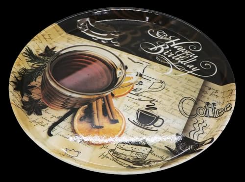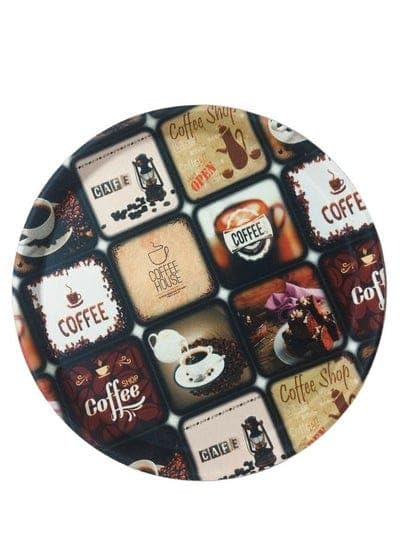 - تصميم جذاب: صينية تقديم دائرية بتصميم القهوة الأنيق مع أشكال متعددة من فناجين القهوة وحبوب البن والشعارات الكلاسيكية