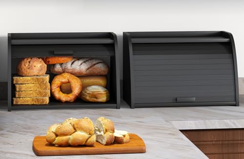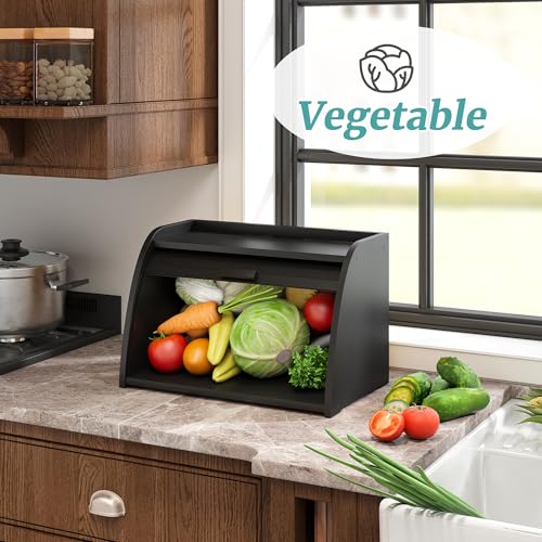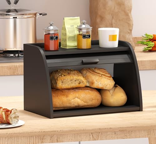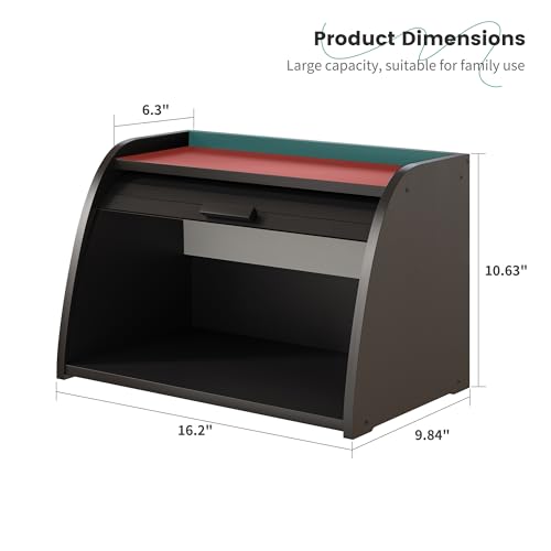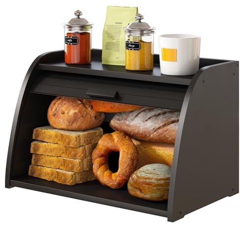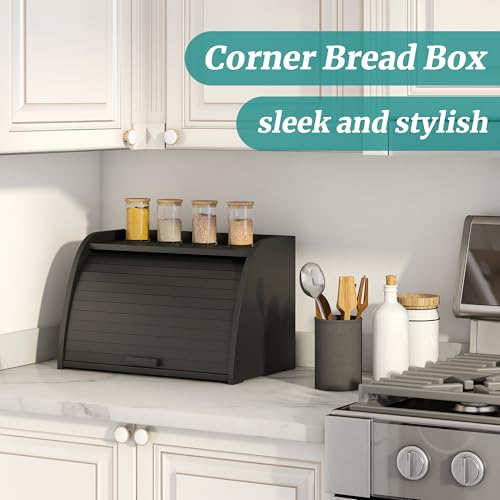 Vriccc - صندوق خبز اسود لسطح المطبخ، صندوق خبز من خشب الخيزران، سعة تخزين الخبز بزاوية خشبية