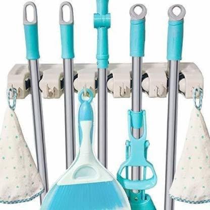 generic - منظم حامل مكنسة يثبت على الحائط مع 5 فتحات و6 خطافات، رف تنظيف شديد التحمل للمطبخ والحمام وادوات الغسيل ونظام تخزين الممسحة موفر للمساحة
