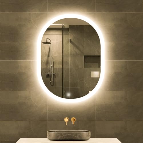 • تصميم أنيق بإضاءة خلفية: مرآة حائط بيضاوية الشكل تتميز بإضاءة خلفية LED دافئة تخلق توهجًا ناعمًا ومحيطًا حول المحيط للحصول على مظهر عصري ومتطور في أي حمام أو منطقة زينة