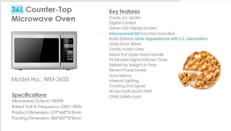 - طاقة الشواية: 1100 وات والتيار الحراري: 1000 وات، بخاصية إذابة الثلج (ديفروست) بالوزن او الوقت، مؤشر إتمام الطهي، يحتوي قفل سلامة للأطفال، أحد عشر مستوى طاقة، قوائم اوتوماتيكية.