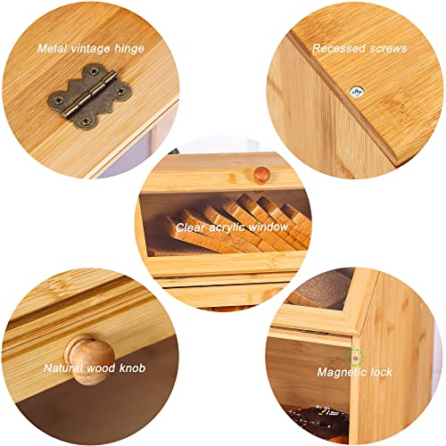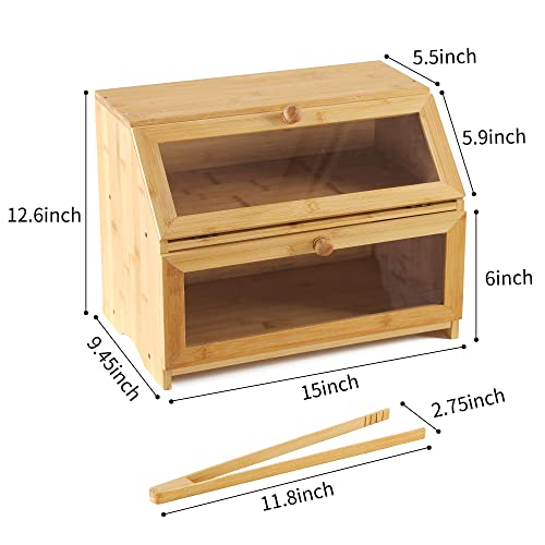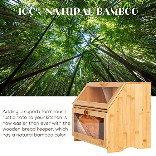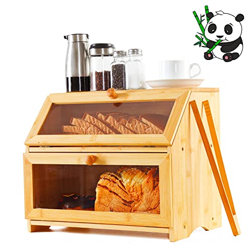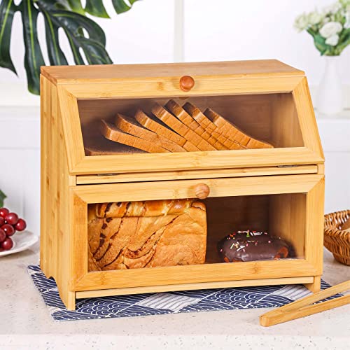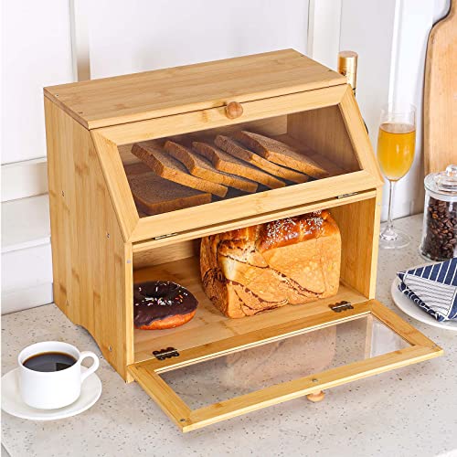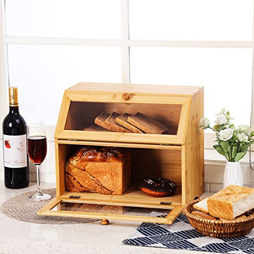 Wodfurnite - صندوق خبز من الخيزران بطبقة مزدوجة مع نوافذ شفافة، صندوق تخزين خبز خشبي كبير جدًا لسطح المطبخ، يحافظ على الطعام طازجًا للخبز والخبز المحمص والحلوى، سهل التجميع الذاتي من وودفورنيت