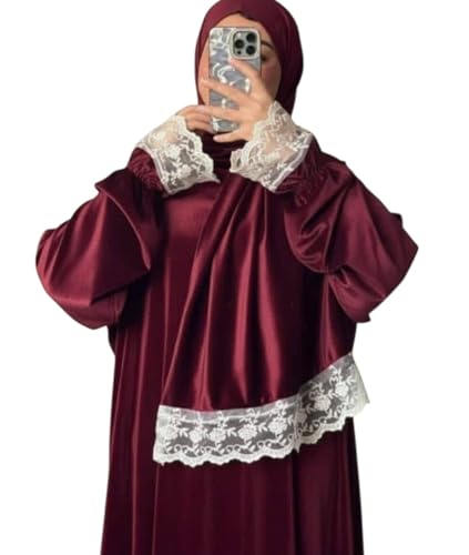 Generic - عباية نسائية بأكمام منفوخة مع دانتيل، لون عنابي، تصميم فاخر، ملابس محتشمة