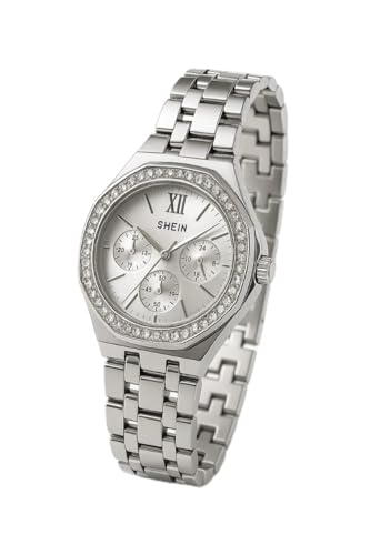 Generic - ساعة يد نسائية كلاسيكية، إطار مرصع بالكريستال، سوار ستانلس ستيل فضي، مينا فضية، قطر ٣,٥ سم