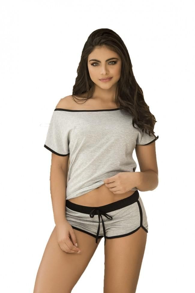 Generic - بيجامة نسائية قطن شورت، طقم نوم قطعتين باللون الرمادي مع تقليم أسود