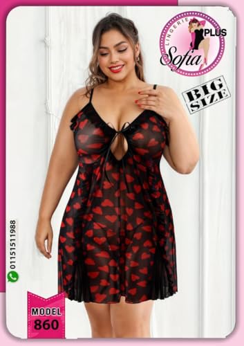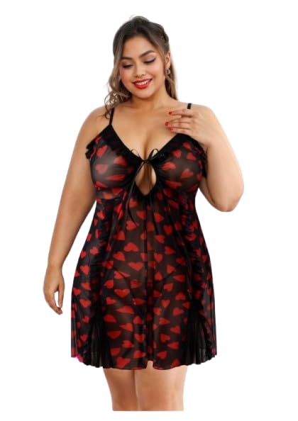 Generic - فستان نوم نسائي مقاس كبير، تصميم قلوب أحمر وأسود، بحمالات رفيعة
