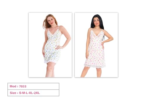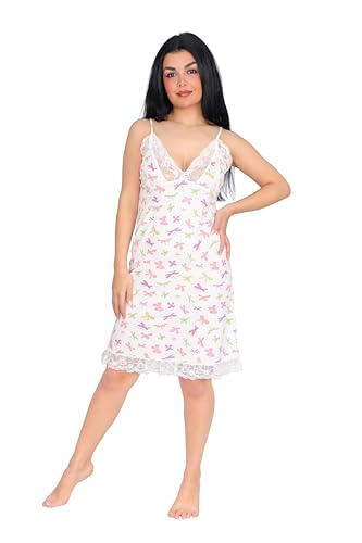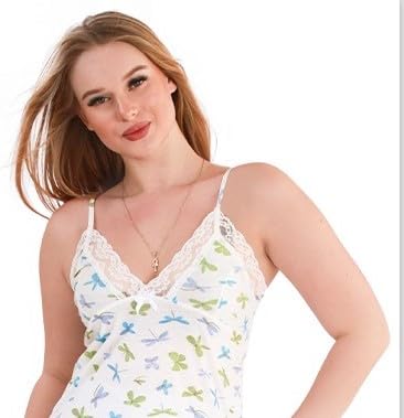 Dadoush - قميص نوم نسائي بحمالات مع دانتيل، بوليستر وقطن، بنقشة فراشات ملونة باللون الأخضر والزهري