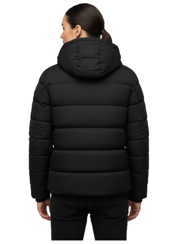 Generic - جاكيت شتوي منفوخ للنساء، معطف اسود مبطن بغطاء للرأس، ملابس خارجية مبطنة بسحاب