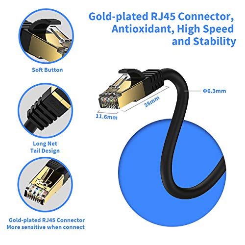 Zosion - كابل ايثرنت الفئة 8 من زوسيون، 15 م، كابل إنترنت عالي السرعة 2000 ميجا هرتز 40 جيجابايت في الثانية الفئة 8 15 م، متين مطلي بالذهب، وصلة ار جيه 45 للألعاب والكمبيوتر والتلفزيون وبلاي ستيشن 4 وXbox