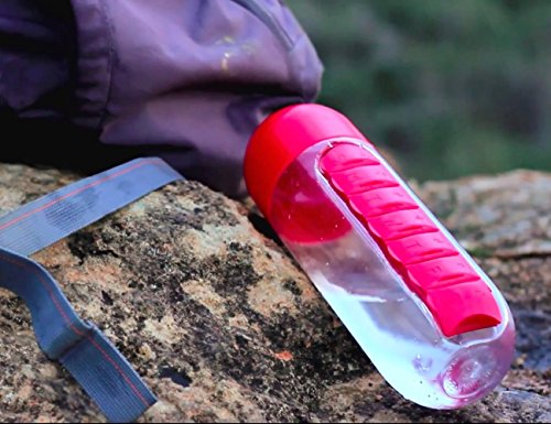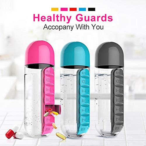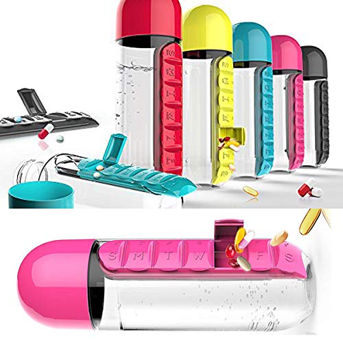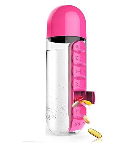 زجاجة مياه رياضية محمولة 2 في 1 من البلاستيك بسعة كبيرة 600 مل، تجمع بين مخطط 7 أيام وعلب أقراص قابلة للإزالة لتنظيم الأدوية، محكمة الإغلاق للسفر والنشاطات الخارجية، (وردي)