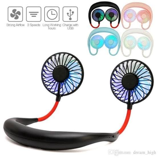 مروحة رياضية محمولة يمكن تعليقها على الرقبة دون الحاجة لامساكها، تعمل ببطارية وقابلة لاعادة الشحن مع 3 مستويات للتبريد وتصميم مشابه لسماعات الراس، من تي اف اس توب فانز، ألوان متنوعة