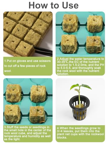 - 【استخدام سهل】أولاً، ارتدي القفازات واستخدم المقص لقطع بضع قطع من الصوف الصخري. ثم اضبط درجة حرارة الماء إلى 30-35 درجة مئوية، وانقع الصوف الصخري جيدًا بمحلول المغذيات إلى 1.5-2.0 مللي ثانية، ودرجة الحموضة إلى 5.0-5.5، وانقع الصوف الصخري جيدًا بمحلول المغذيات. بعد ذلك، ضع البذور أو الشتلات في الفتحة الصغيرة في منتصف مكعب الصوف الصخري، واضبط درجة الحرارة والرطوبة بالإضافة إلى الضوء. يرجى ملاحظة ما يلي: قم برش الماء في الوقت المناسب للحفاظ على رطوبة مكعب الصوف الصخري.