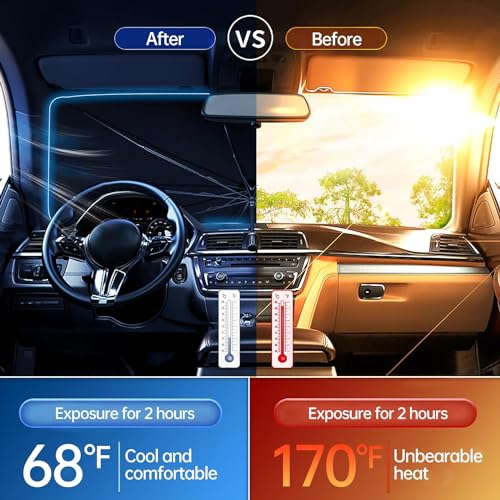 - 【احم نفسك وسيارتك】يمكن لمظلة الزجاج الأمامي للسيارات أن تحميك بفعالية من أشعة الشمس وتوفر لك بيئة قيادة باردة تحافظ على المقاعد ولوحة القيادة من التشوه بسبب التعرض لأشعة الشمس.