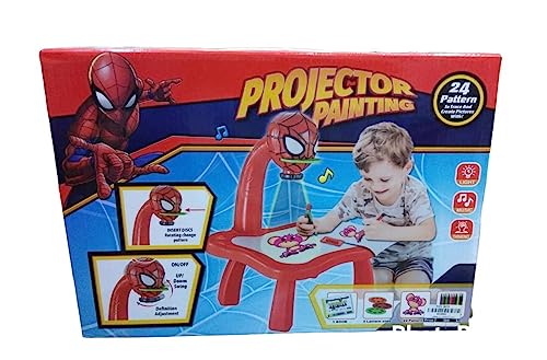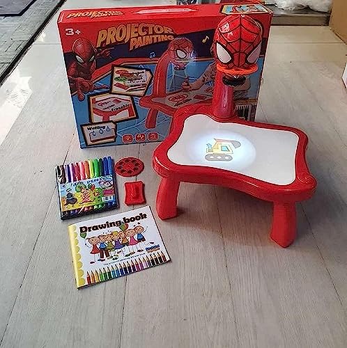 سبورة طباشير بجهاز عرض على شكل عنكبوت أحمر - 24 نموذج رسم مع 12 لون فلوماستر - ودفتر رسم