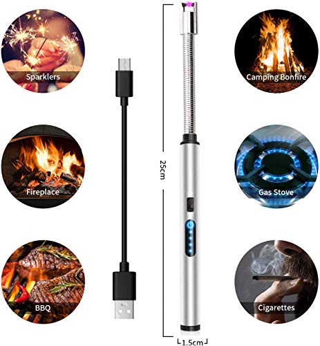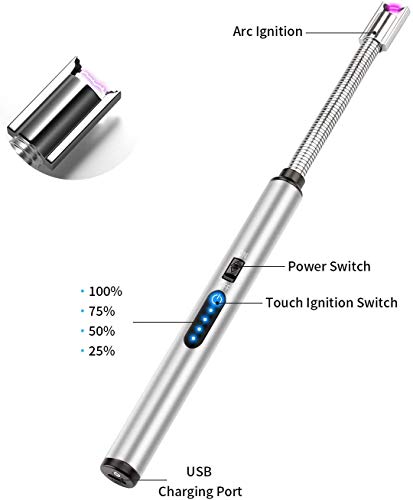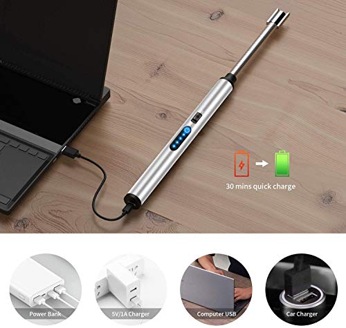 ولاعة كهربائية قابلة لإعادة الشحن بمنفذ USB مع شاشة عرض بطارية، قوس لمس مقاوم للرياح لإضاءة الشموع والألعاب النارية والموقد والتخييم (لون أسود) - فضي