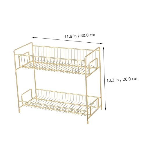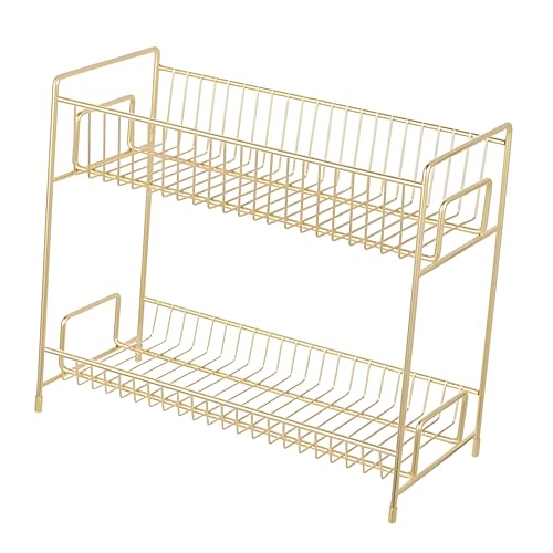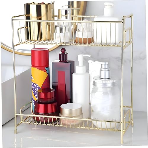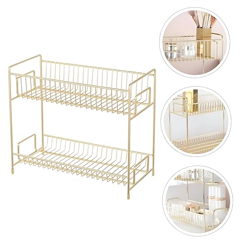 رف منظم مستحضرات التجميل المعدني الذهبي، حل تخزين للمكتب، حامل مكياج، حامل من طبقتين، استخدامات متعددة، الأبعاد: 26*30*14.5 سم - مثالي للحفاظ على منتجات التجميل الخاصة بك مرتبة وسهلة الوصول إليها