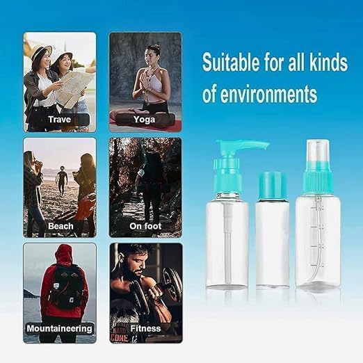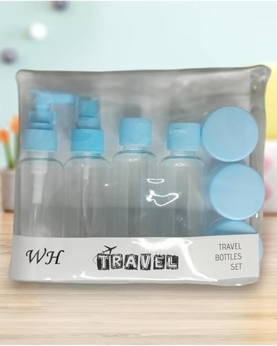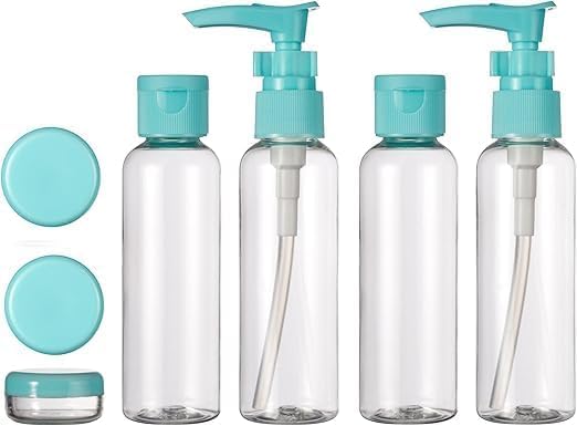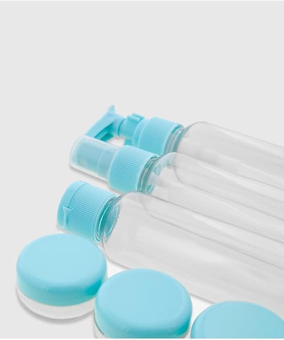 زجاجات سفر لمستحضرات التجميل قابلة للضغط وإعادة الملء ومقاومة للتسرب ، مجموعة مع ملصقات للشامبو والبلسم ومستحضرات وجل الاستحمام (أزرق فاتح)، بلاستيك