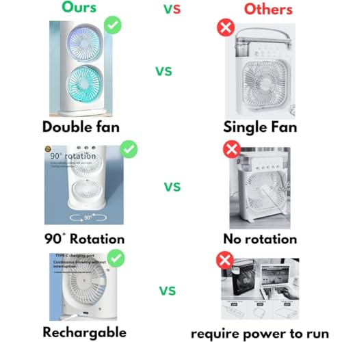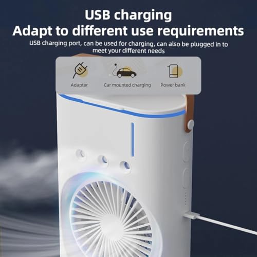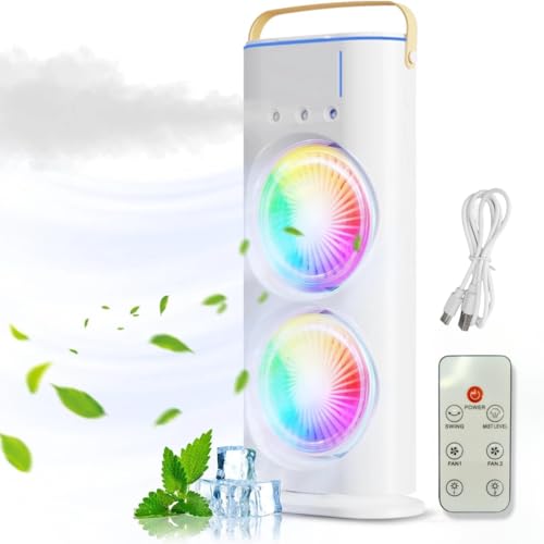 - مكيف هواء محمول مع مروحتين، مبرد هواء صغير، مروحة رذاذ مرطب محمولة بتصميم تكييف بمروحة مزدوجة، مبرد تبخيري صغير سعة 280 مل، تكييف شخصي USB مع إضاءة ليد، تكييف تبريد بمروحة مزدوجة للسيارة والمنزل والمكتب والغرفة.