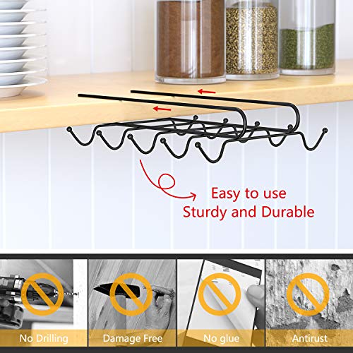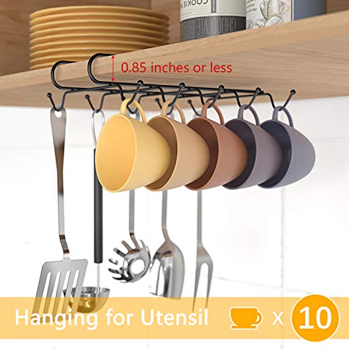 حامل مجات يثبت تحت الخزانة ، دون مسامير ذو 10 خطافات يحمل حتى فناجين شاي أو قهوة أواني المطبخ - أسود منون تو فور معدن